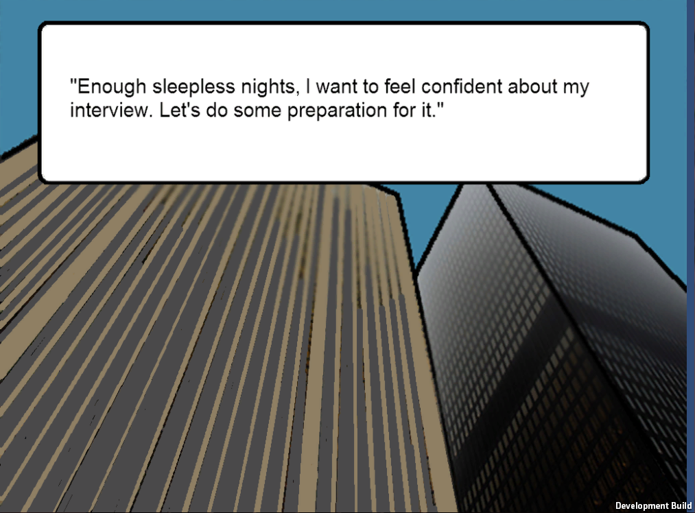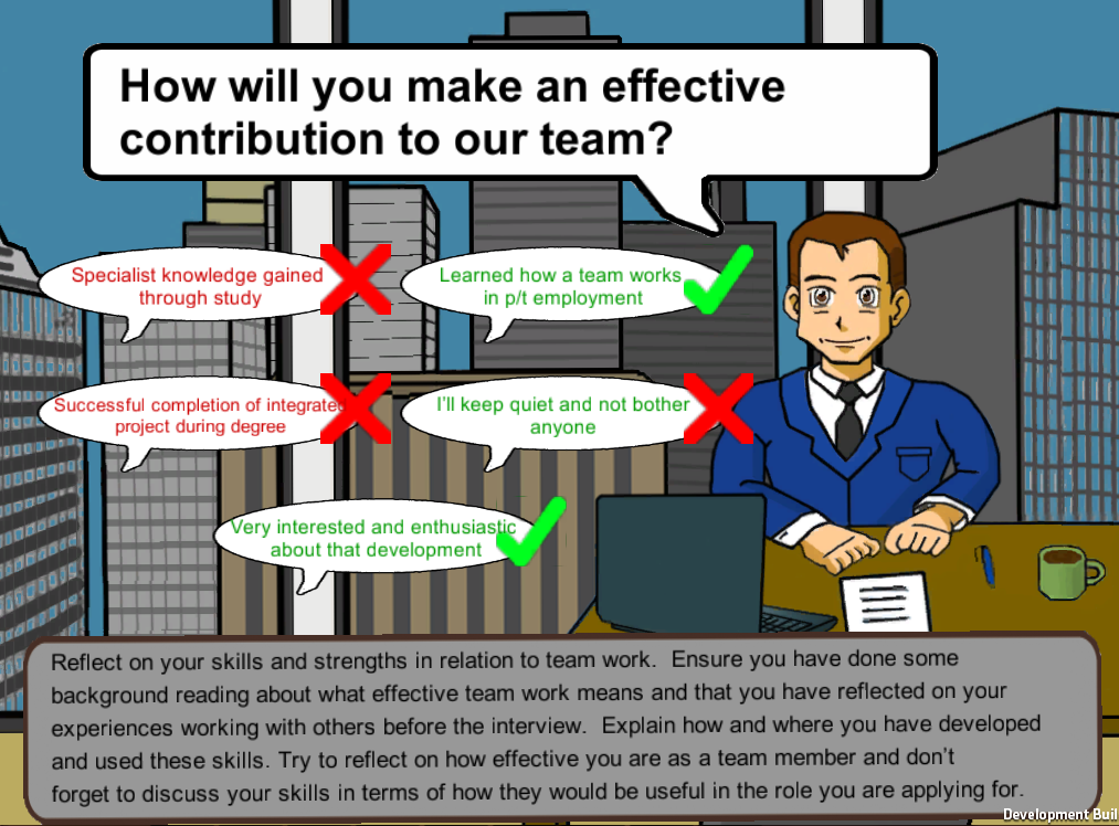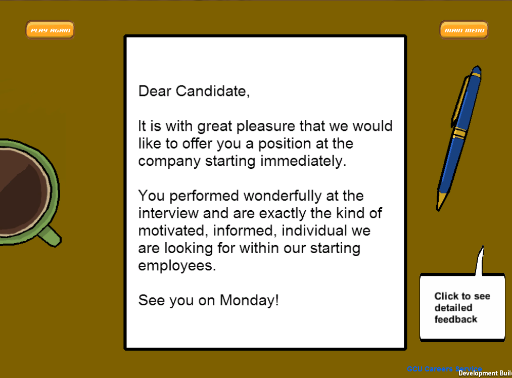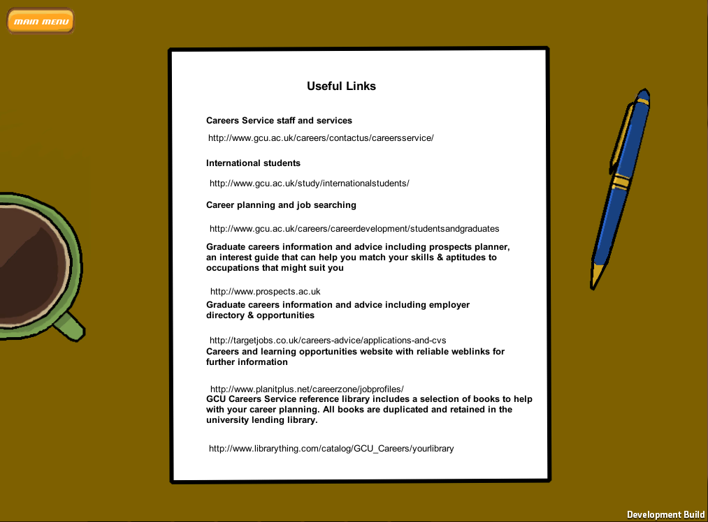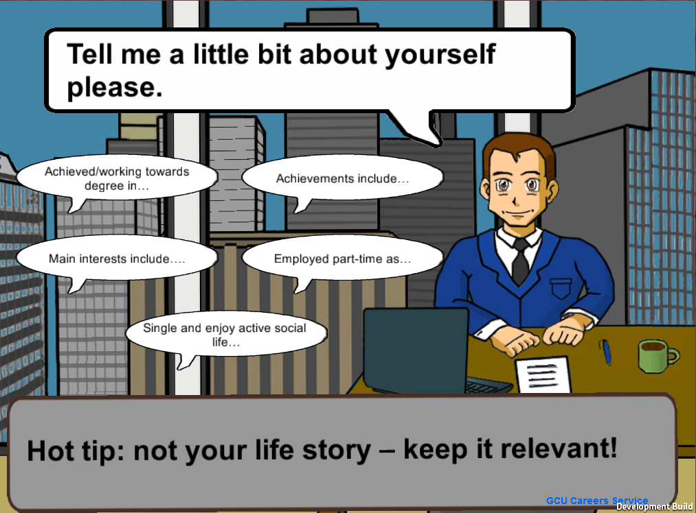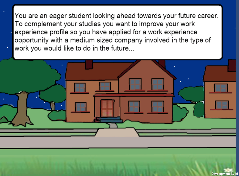 The project was created using Unity3D with the final objective being a browser based game to be displayed on Glasgow Caledonian University's Careers Advice website.