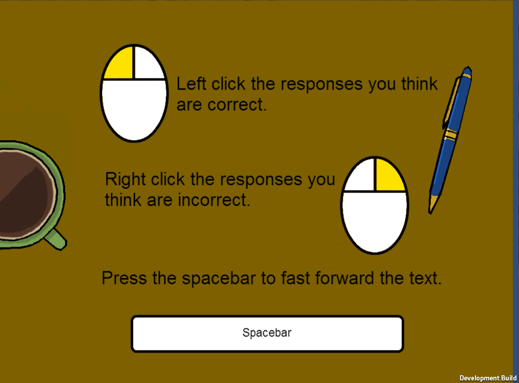 Two forms of gameplay were created for the original version of this game. The game was to ask the more traditional interview questions of the player with the player selecting and highlighting all of the correct and incorrect answers made up the majority of the game, with a large pool of questions being available and chosen at random during the course of the session - which the player then recieves feedback about at the end of gameplay.