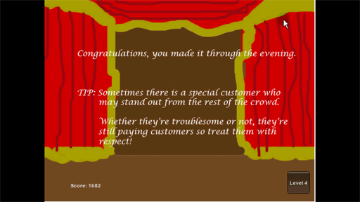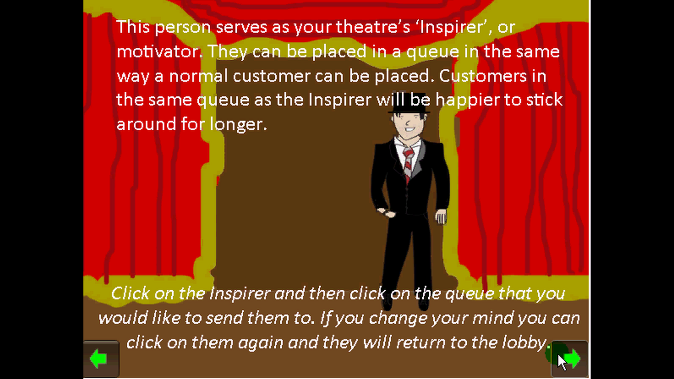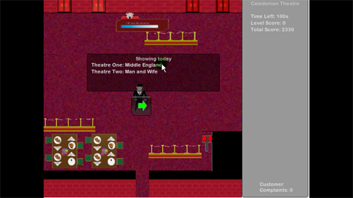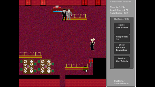 In Caledonian Theatre you play as the manager of a large theatre complex directing the arriving audience to where they need to go within the building, be it one of the four theatres within the complex, or the theatre's café or restrooms. Unattended audience members will become restless until they are guided to the appropriate area so the objective of the game is to get the audience to where they need to be as quickly as you can in an environment heavily inspired by Diner Dash.